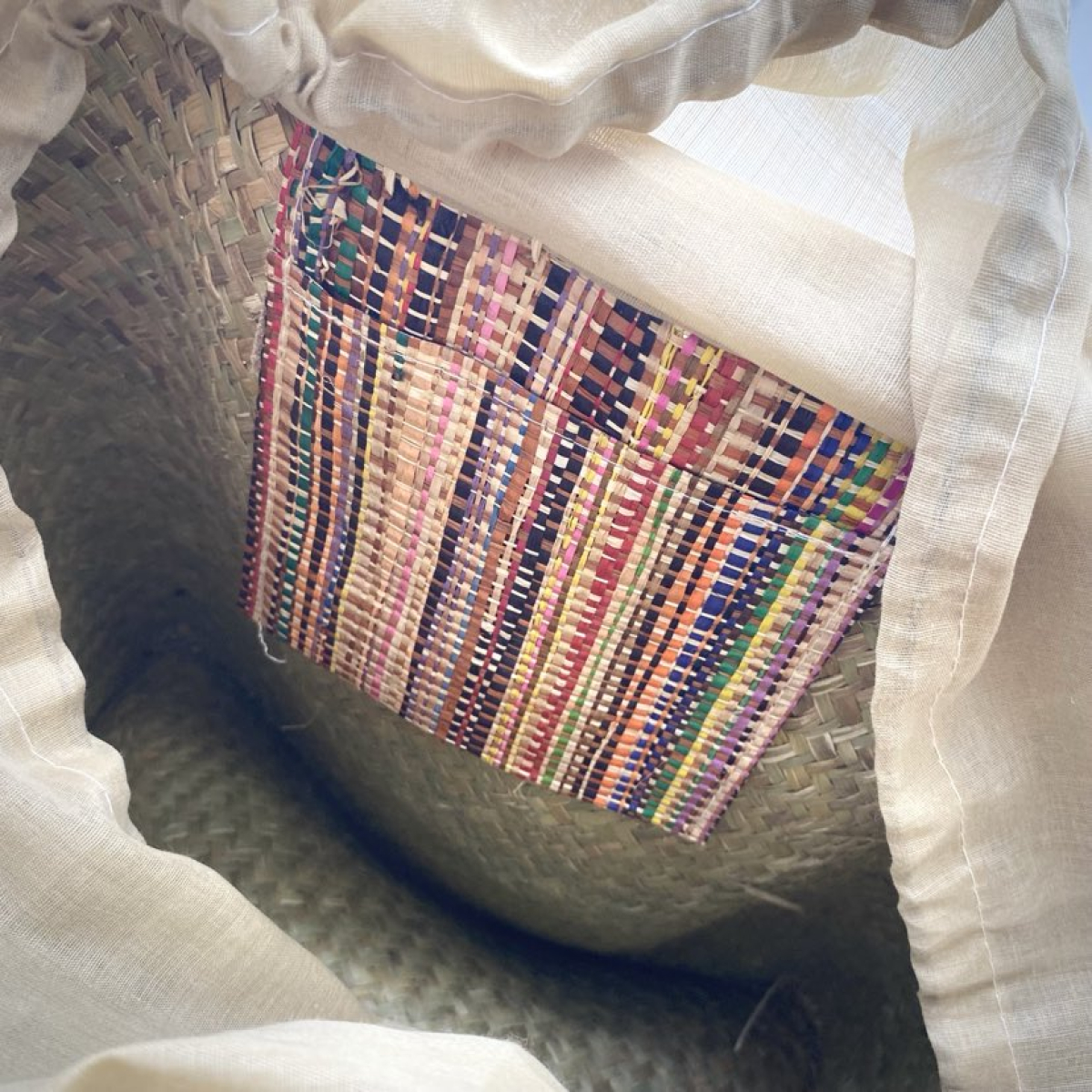 It has a raffia pocket on the inside and a drawstring fastening.