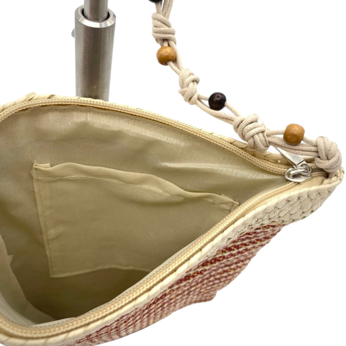 The long fabric handle with wooden beads adds a boho, artisanal feel to the bag, creating a lovely contrast with the woven rope. It's a bag that could work well for casual outings or even a slightly dressier event, thanks to its sophisticated yet simple feel.