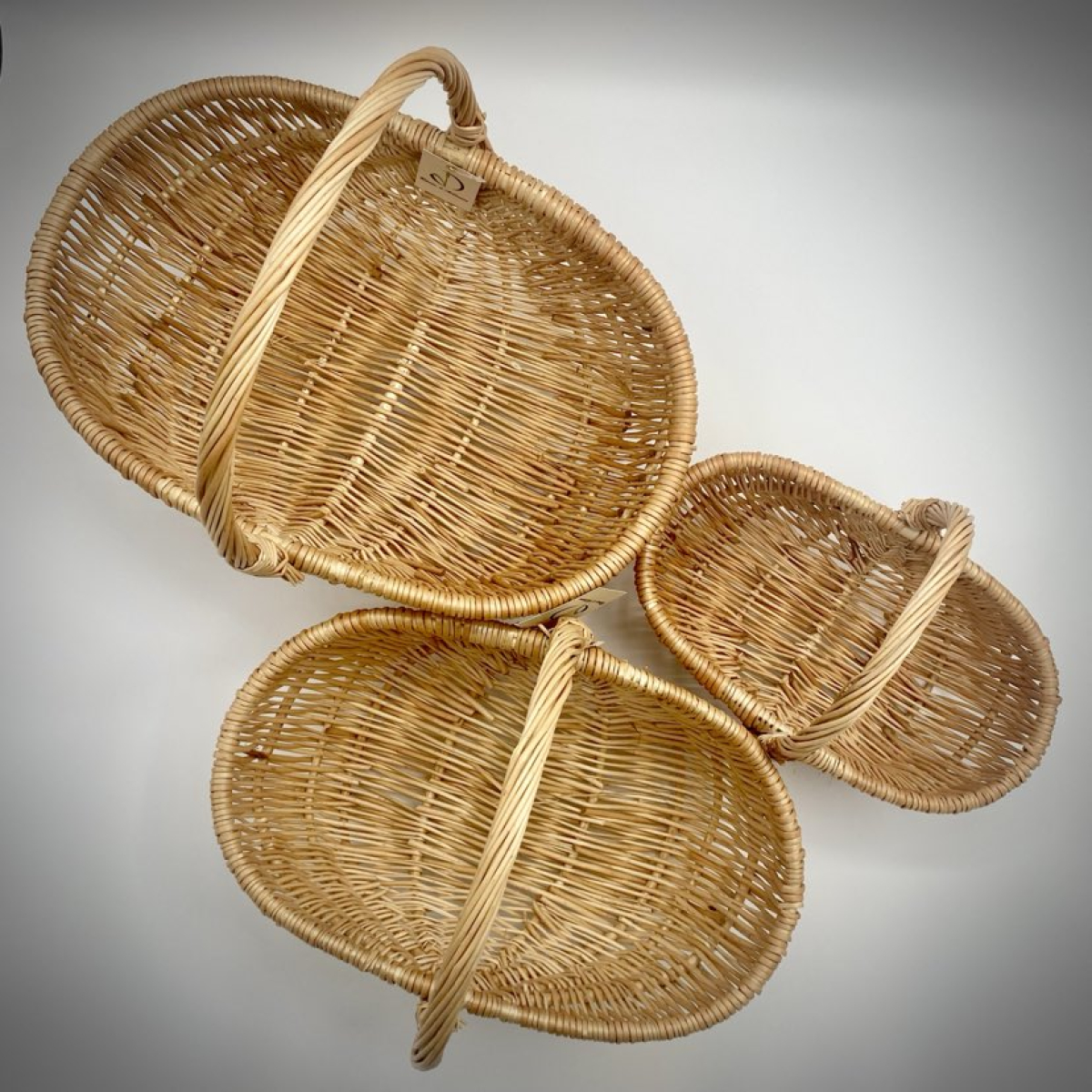 Ce panier est généralement fabriqué en osier blanc, une variété d'osier clair ou blanc, ce qui lui donne une couleur douce et lumineuse. Les paniers bourguignons ont souvent une forme arrondie et sont dotés de poignées robustes, ce qui les rend distinctifs pour transporter des produits agricoles comme des raisins secs, des fruits, ou des fromages.