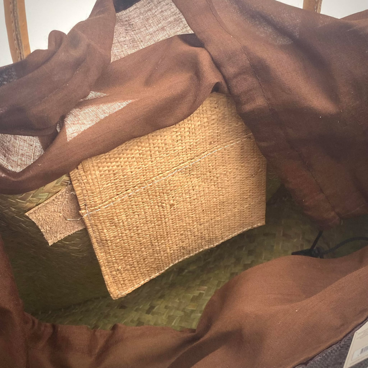 Cabas avec système de fermeture à cordon à resserrer, avec petite poche en raphia à l'intérieur. Les coins sont renforcées en cuir ainsi que les anses.