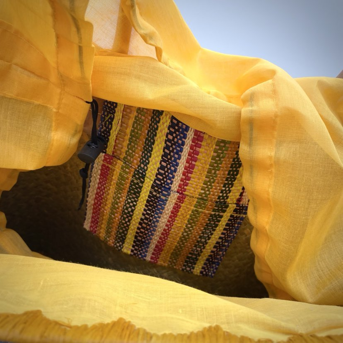 Il possède une poche en raphia à l'interieur, et son système de fermeture est un cordon à serrer.