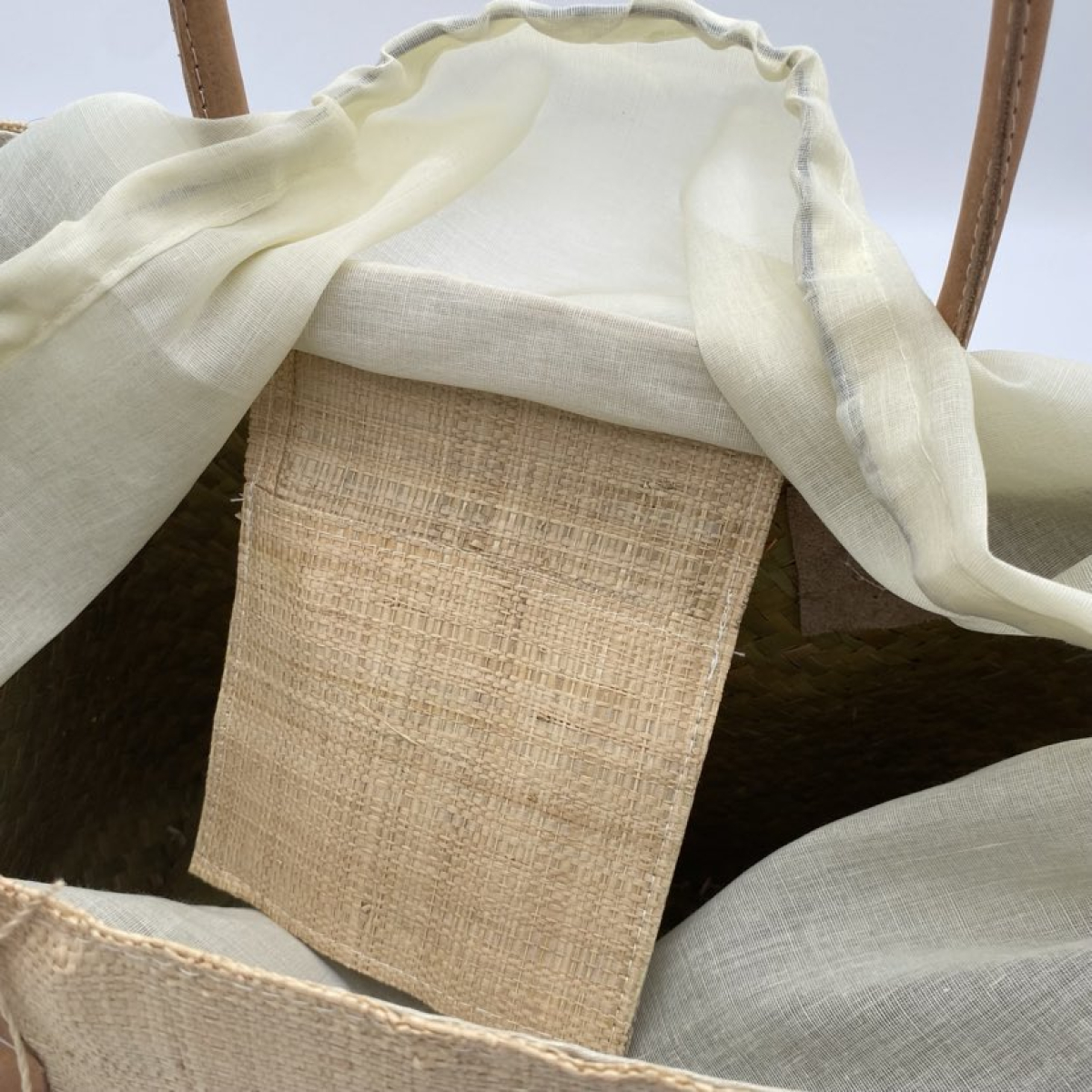 Il possède une poche en raphia à l'interieur, et son système de fermeture est un cordon à serrer.