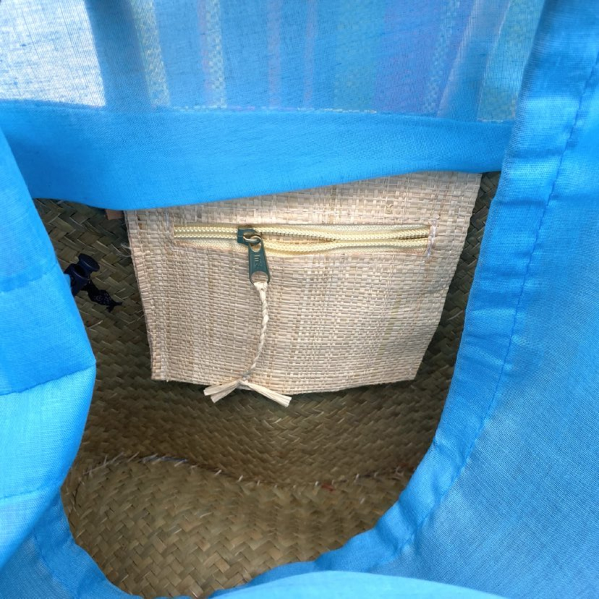 Une petite poche intérieure en raphia, dotée d’une fermeture éclair, permet de ranger vos essentiels en toute discrétion.