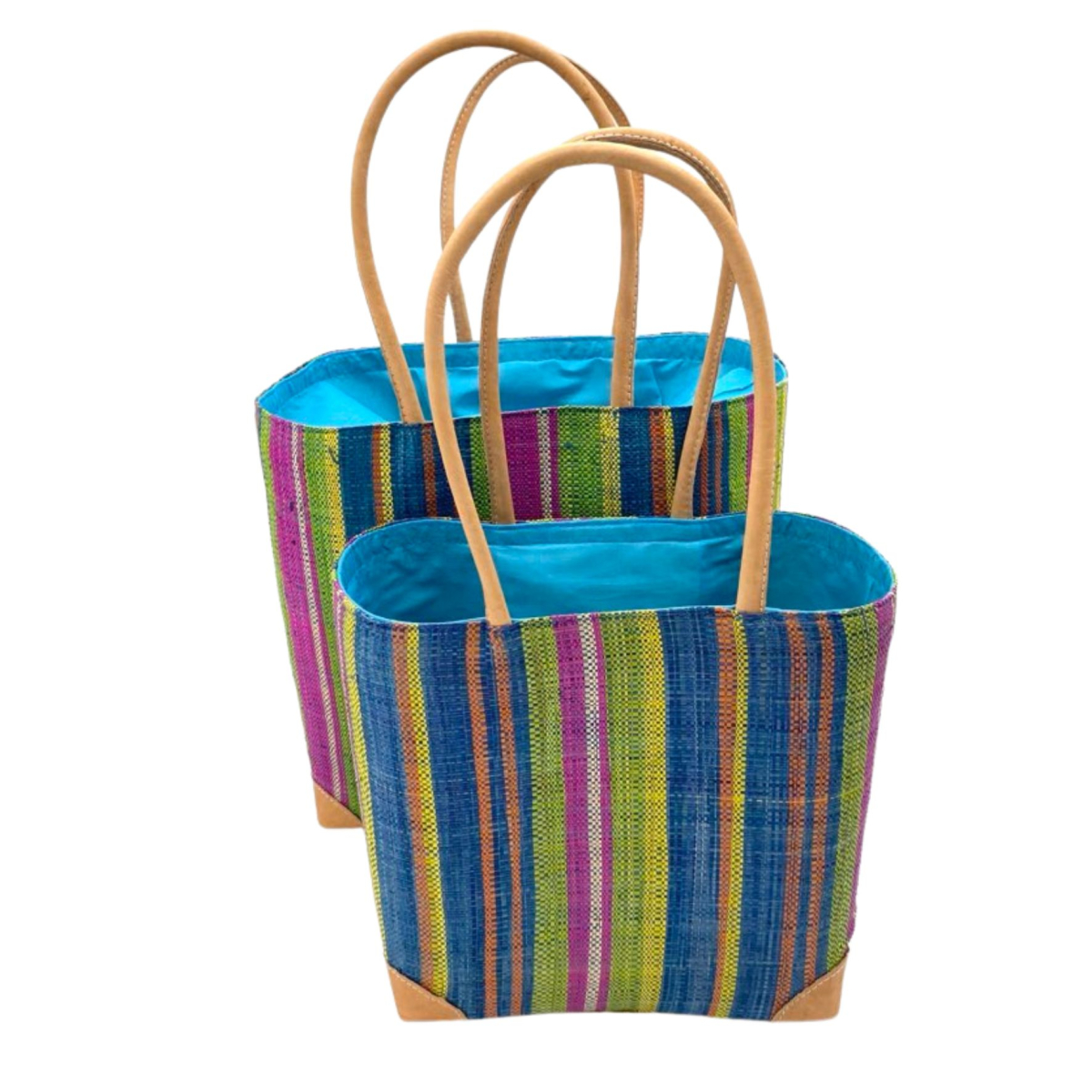 Sac cabas unique est entièrement confectionné en raphia naturel, avec des motifs rayés multicolores dans les tons bleu, apportant une touche artisanale et authentique.
