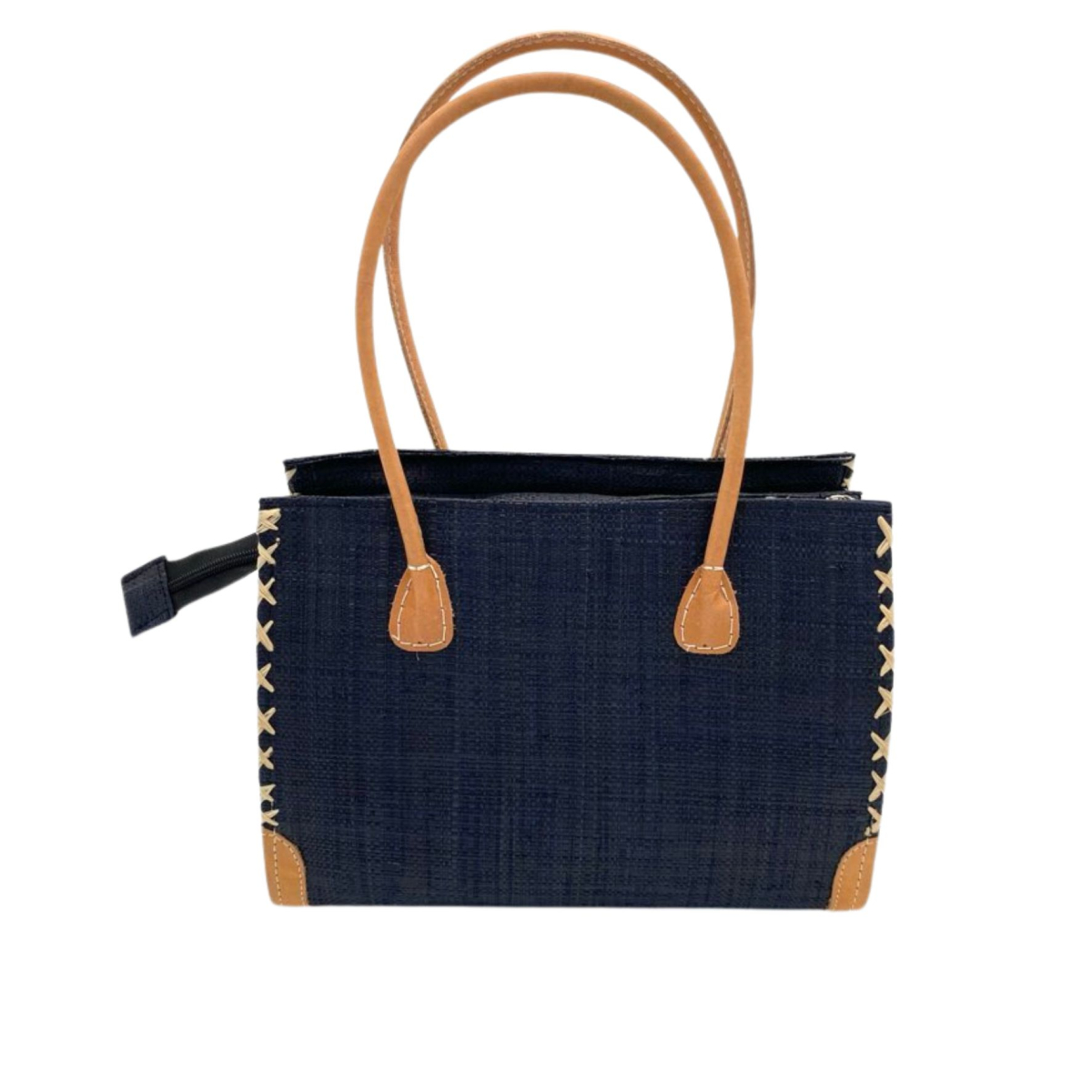Les coins renforcés en cuir et l’anse en cuir apportent structure et durabilité, tandis que les détails en raphia tissé sur les côtés ajoutent du caractère et du relief à sa silhouette.