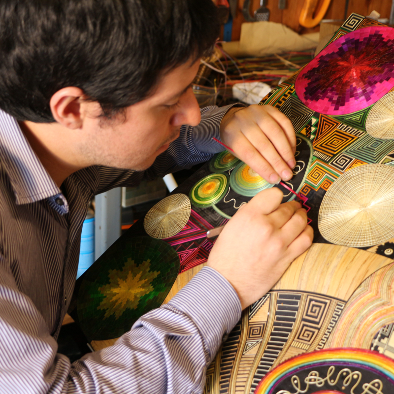 Initiez-vous à cette technique appelé "Enchapado en Tamo" qui consiste à découper et disposer de fines bandelettes de paille pour créer des motifs géométriques ou décoratifs d’une finesse remarquable.